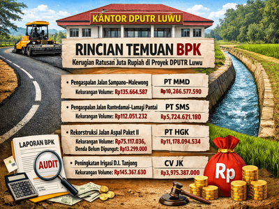Dalam Laporan Hasil Pemeriksaan (LHP) Nomor 34.B/LHP/XIX.MKS/05/2025 tertanggal 23 Mei 2025, BPK mencatat adanya kekurangan volume pekerjaan sebesar Rp468.200.486 dan denda keterlambatan belum dipungut sebesar Rp13.299.000,00 pada empat proyek yang dikelola Dinas Pekerjaan Umum dan Tata Ruang (DPUTR) Kabupaten Luwu Tahun Anggaran 2024.
